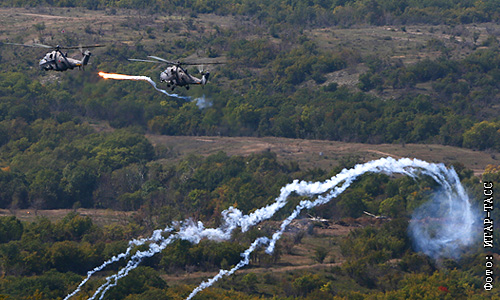 Запуск боевых снарядов во время военных учений "Кавказ 2012" на полигоне "Раевский".