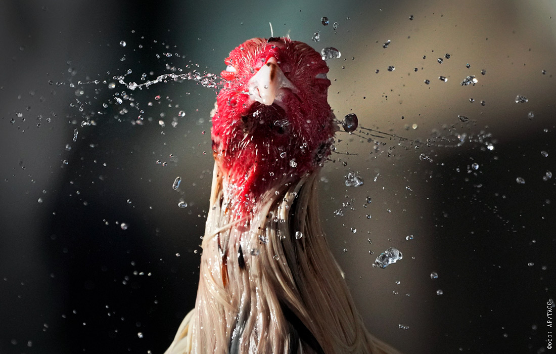 Бойцовый петух охлаждается жарким утром в Кесон-Сити, Филиппины