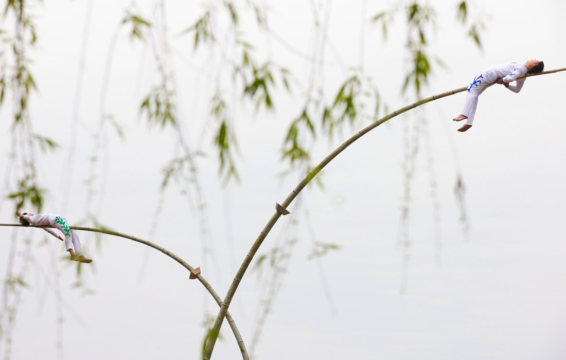Представление на бамбуковых шестах во время фестиваля в Цзясине, Китай
