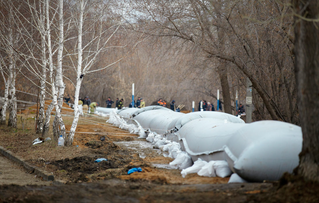 Водоналивная рукавная дамба, поставленная из Госрезерва МЧС для стабилизации паводковой ситуации на реке Тобол