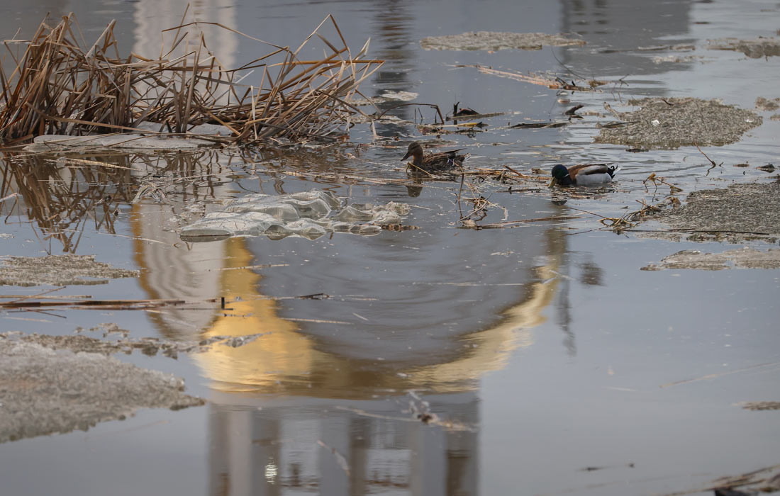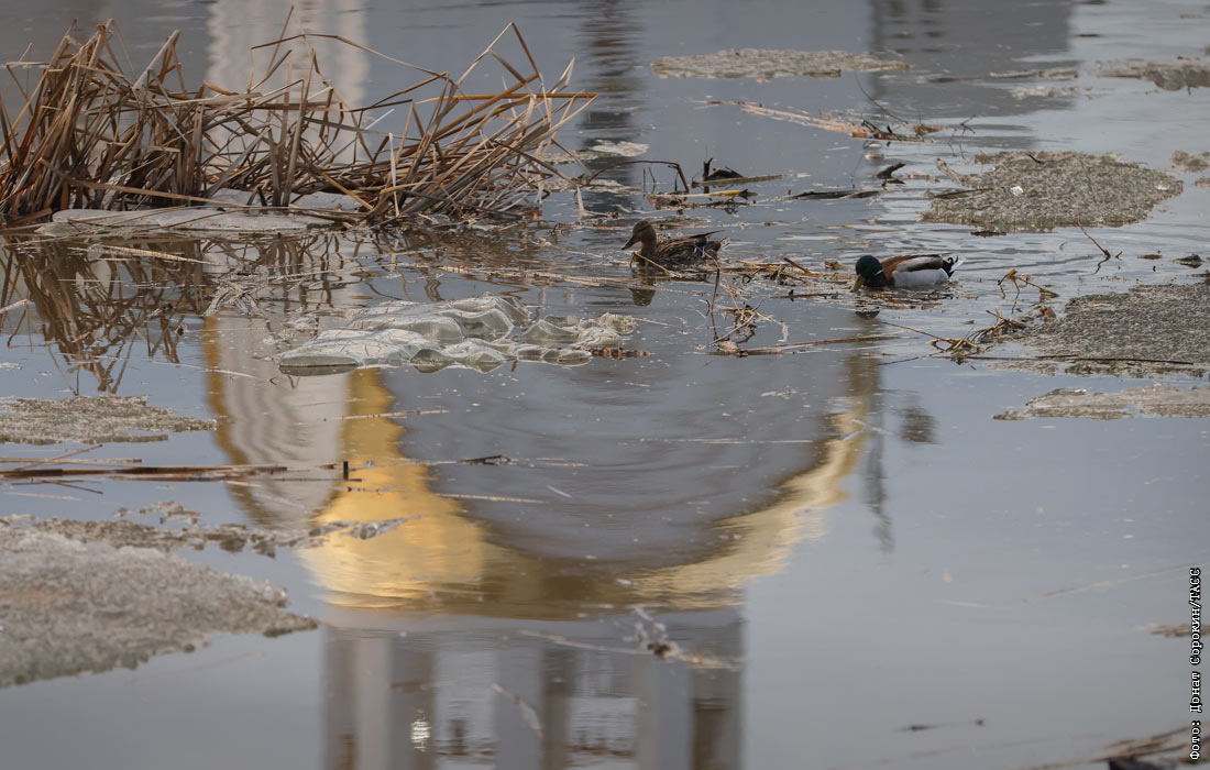 Утки на реке Тобол среди мусора, принесенного паводком