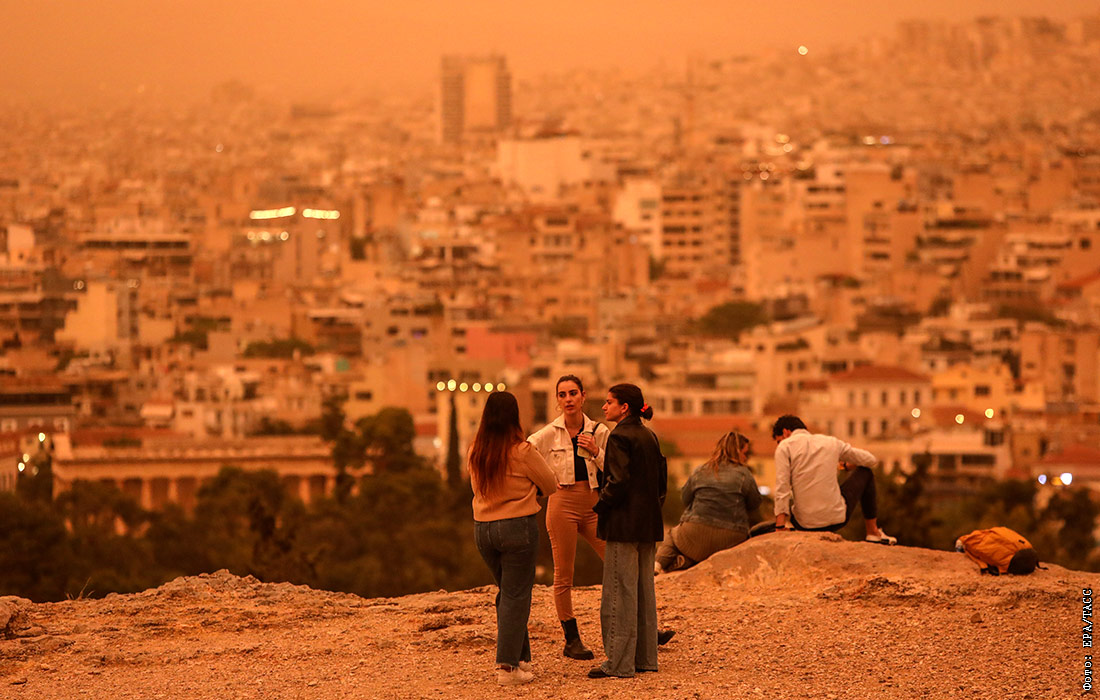 Столицу Греции и соседние районы накрыло большое количество мелкого песка и пыли из африканской пустыни Сахара. Греческие власти рекомендуют людям, страдающим от респираторных заболеваний, избегать выхода на улицу.
