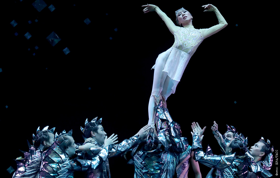 Якутские артисты выступают на сцене во время премьеры спектакля "Сияющий камень" в Киргизии