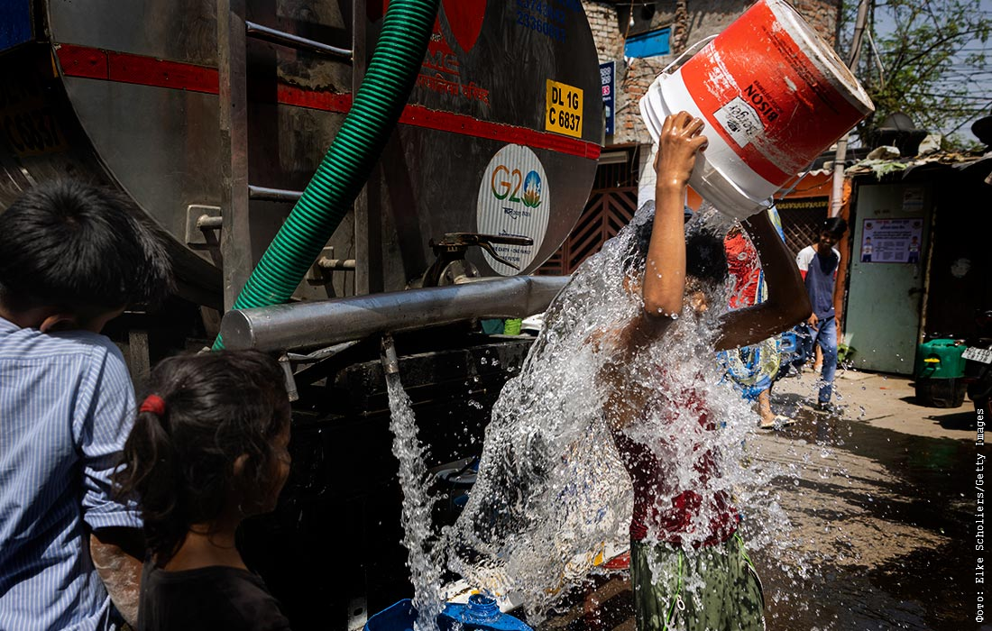 Мальчик охлаждается водой из цистерны в Нью-Дели