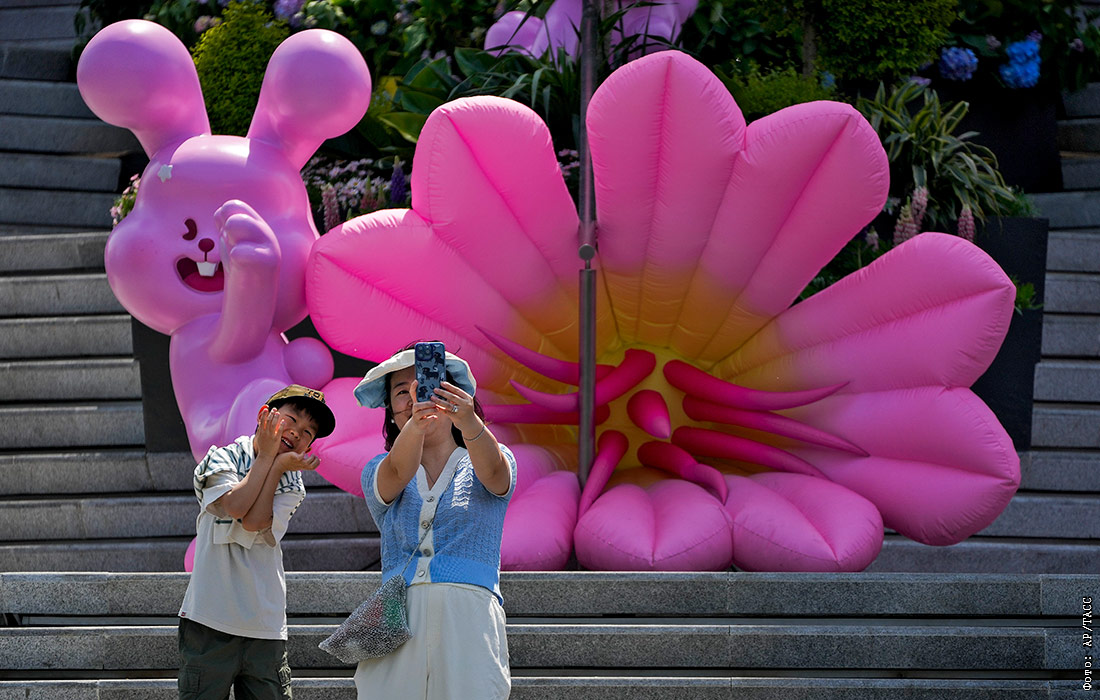 Женщина с ребенком фотографируются возле надувных фигур цветов в Пекине