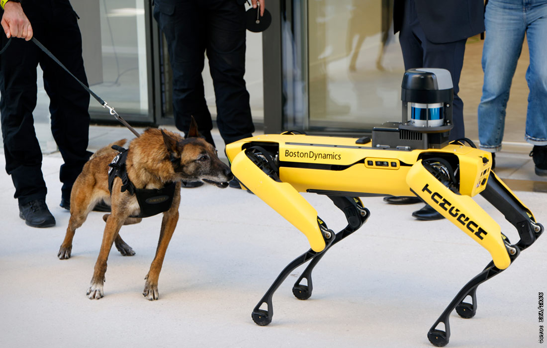 Полицейская собака осматривает робота-собаку Boston dynamics в инновационном и образовательном кампусе в Марселе, Франция