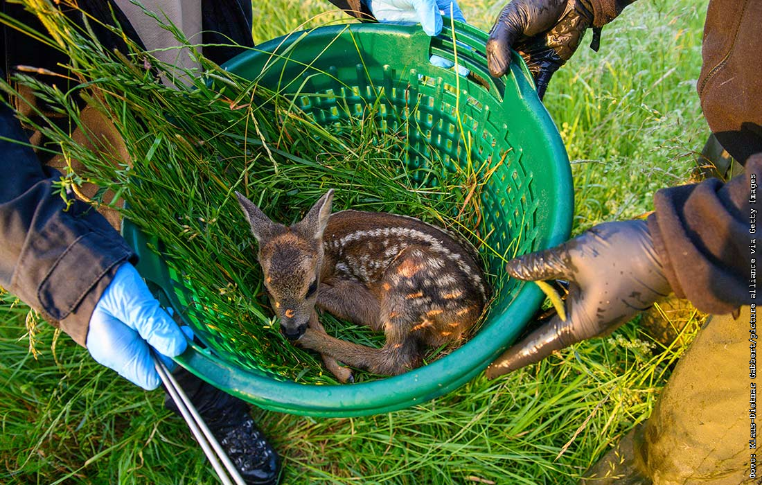 Поиск оленят в высокой траве для спасения от сельскохозяйственной техники в Германии