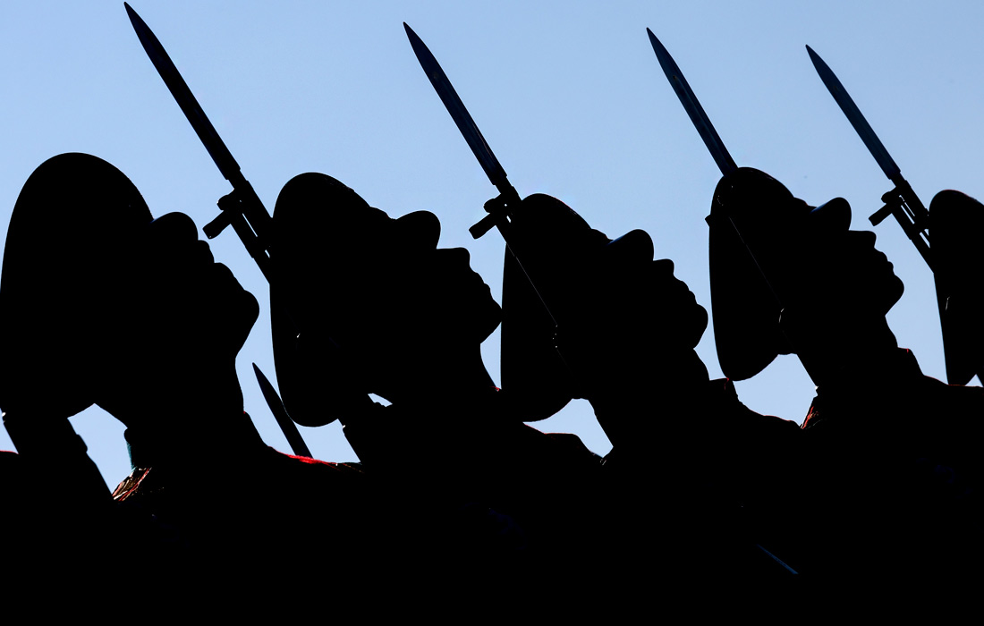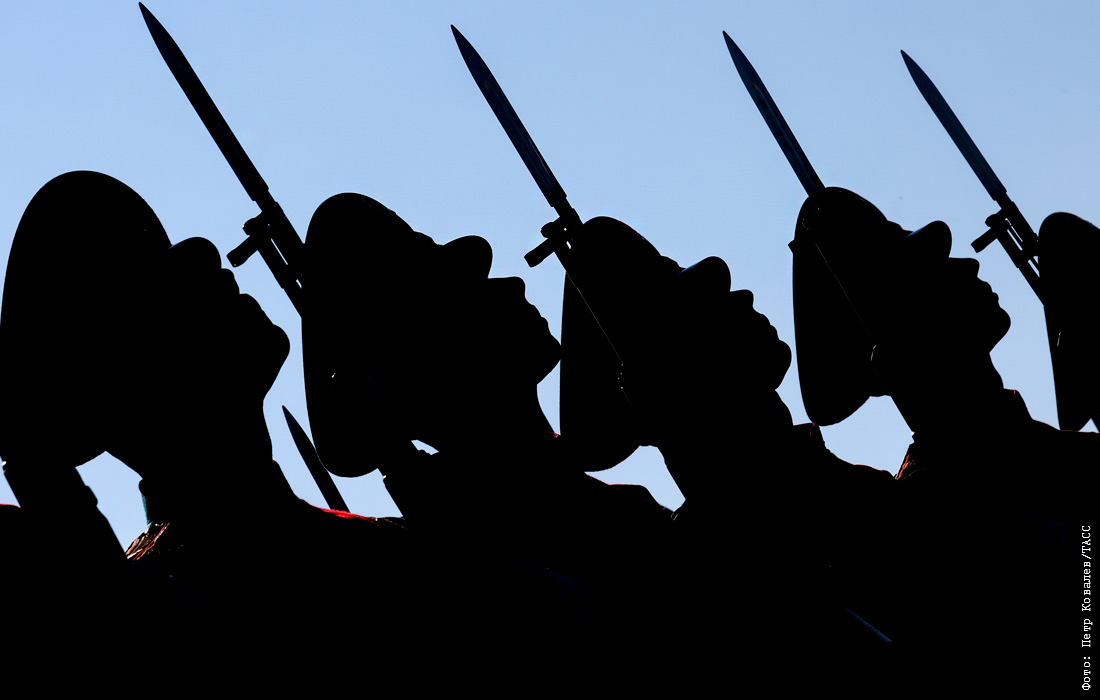 Военнослужащие во время репетиции церемонии возложения цветов к памятнику Петру I в Санкт-Петербурге