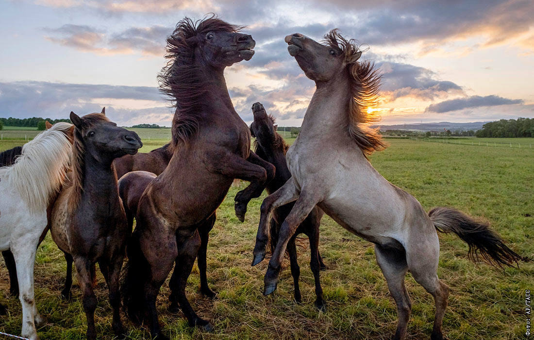 Исландские лошади играют на лугу в Верхайме недалеко от Франкфурта