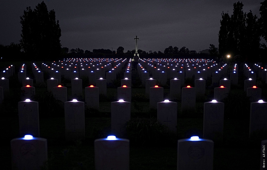 80-летие со дня высадки союзников в Нормандии. На фото: свечи на каждом надгробии военного кладбища Содружества в Банневиль-ла-Кампань, Нормандия, Франция.