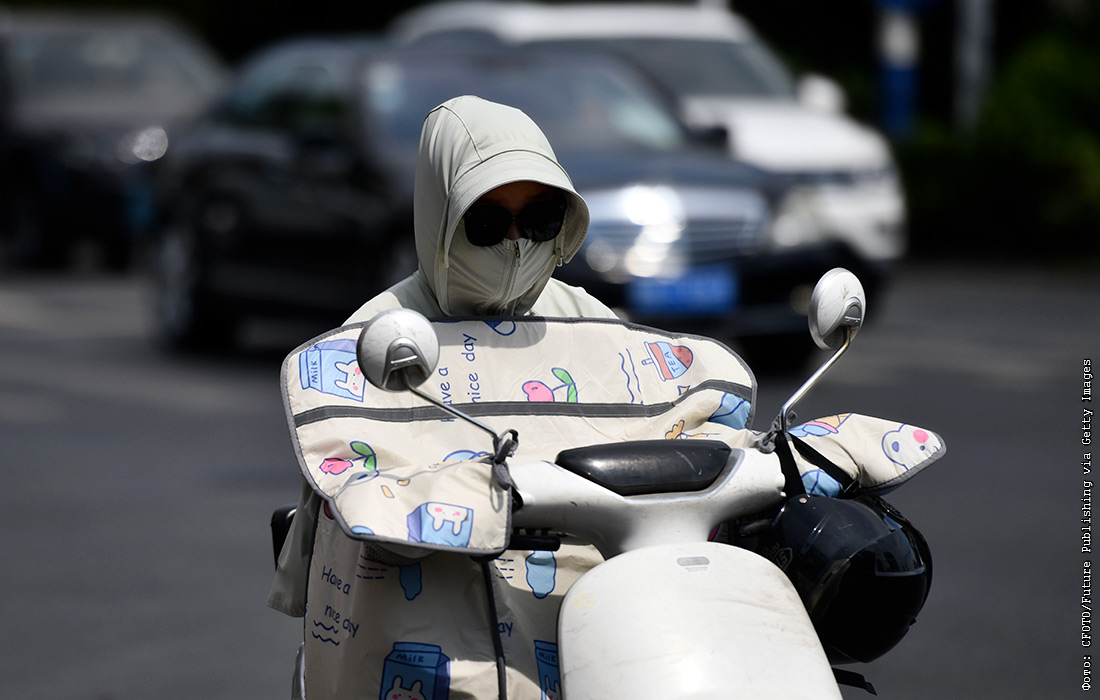 Оранжевое предупреждение о высокой температуре в Китае. На фото: граждане носят солнцезащитную одежду в городе Фуян.
