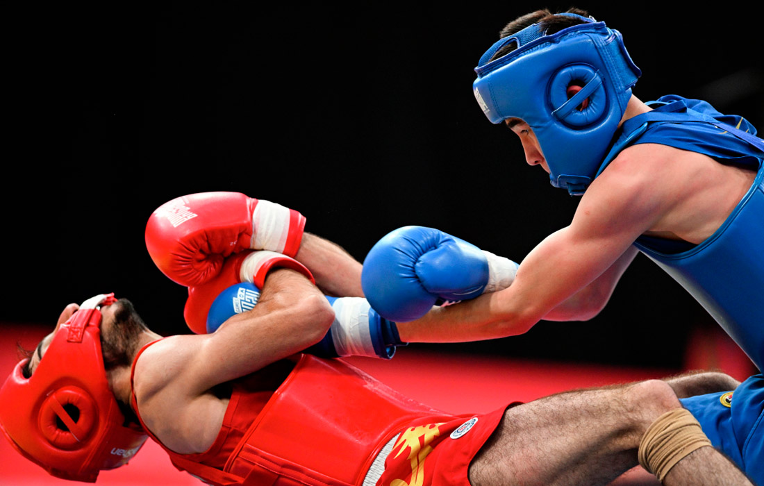 Жирайр Петросян (Армения) и Ислам Иминов (Казахстан) в полуфинальном поединке соревнований по ушу-саньда среди мужчин в весовой категории 52 кг