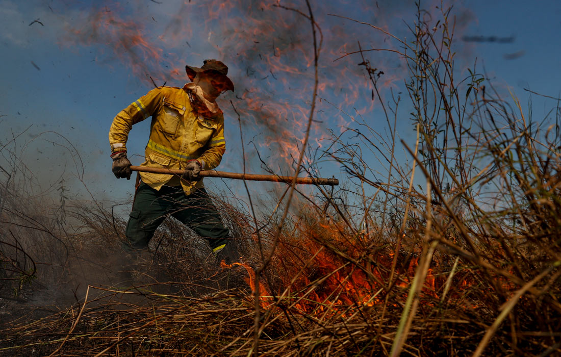 Тушение пожара в бразильском заповеднике Пантанал