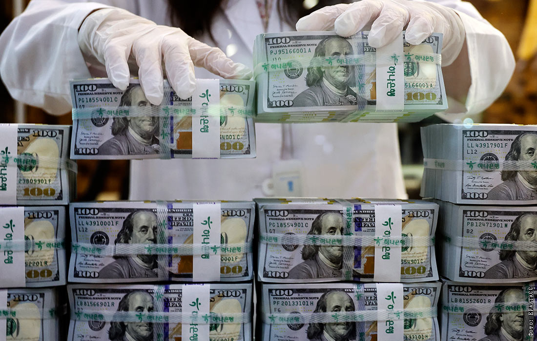 Валютные резервы Южной Кореи в июне 2024 составили $ 412,21 млрд. На фото: сортировка 100-долларовых банкнот США в штаб-квартире Hana Bank в Сеуле.