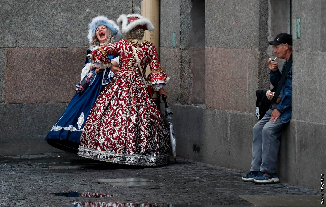Уличные актеры на Дворцовой площади в Санкт-Петербурге