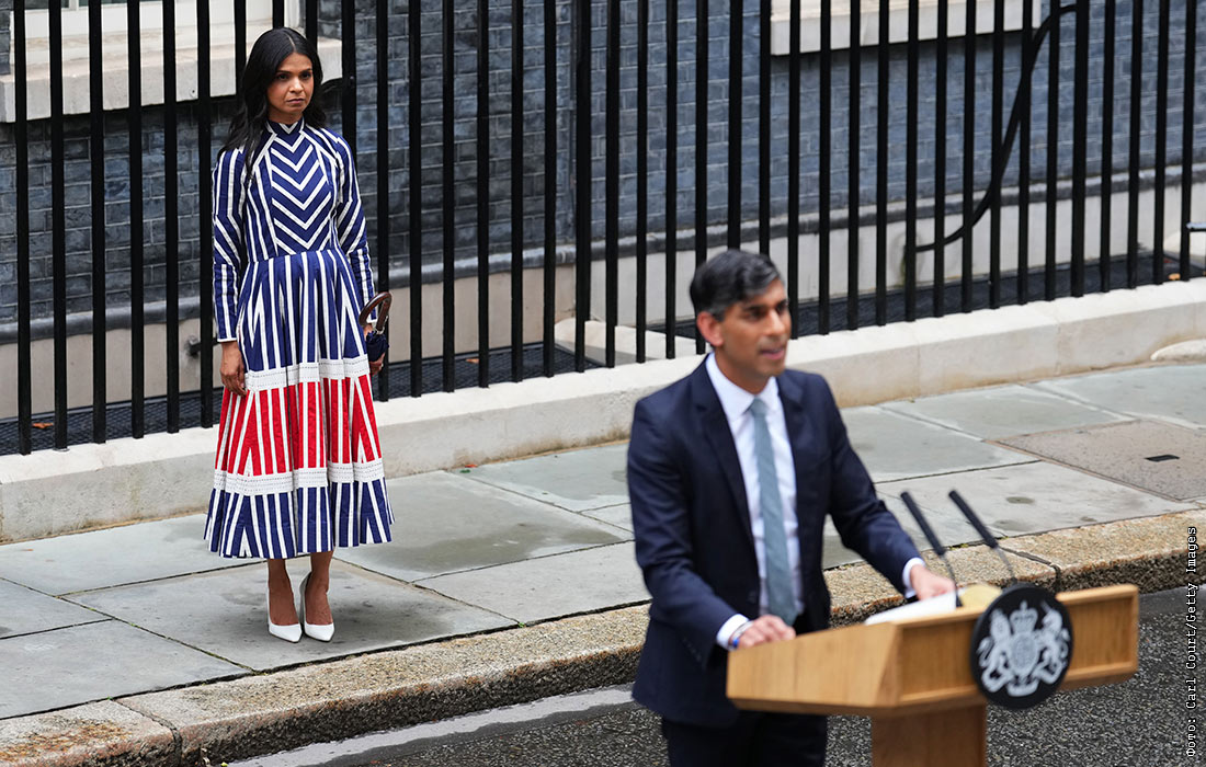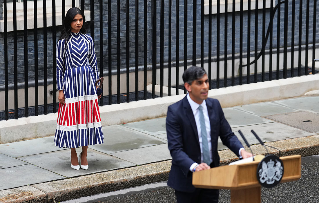 Риши Сунак, уходящий с поста премьер-министра Великобритании, и его супруга Акшата Мурти у резиденции на Даунинг-стрит