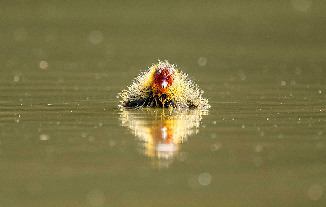 Птенец лысухи во время плавания в пруду в немецком Ротвайле