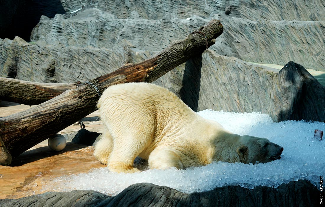 Белый медведь охлаждается в жаркий день в Пражском зоопарке