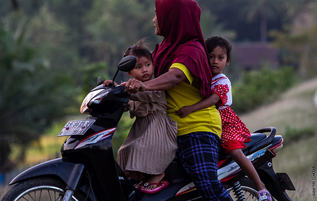 Жительница Джокьякарты (Индонезия) везет детей на мотоцикле