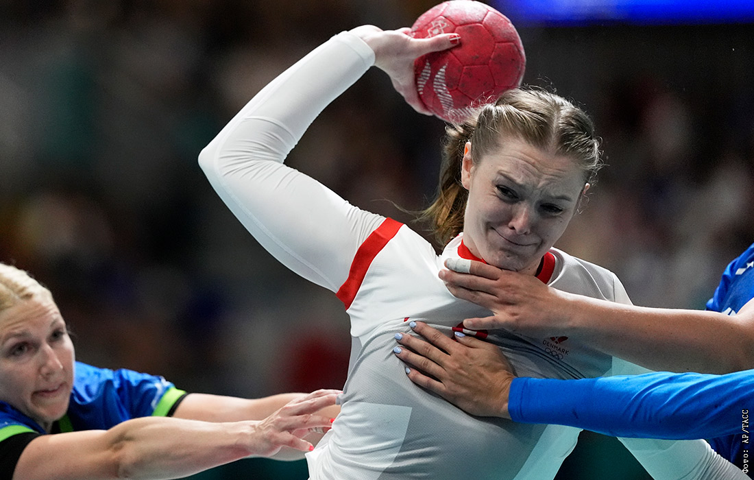 Анн Метте Хансен из сборной Дании по гандболу в матче предварительного турнира летних Олимпийских игр в Париже против команды Словении
