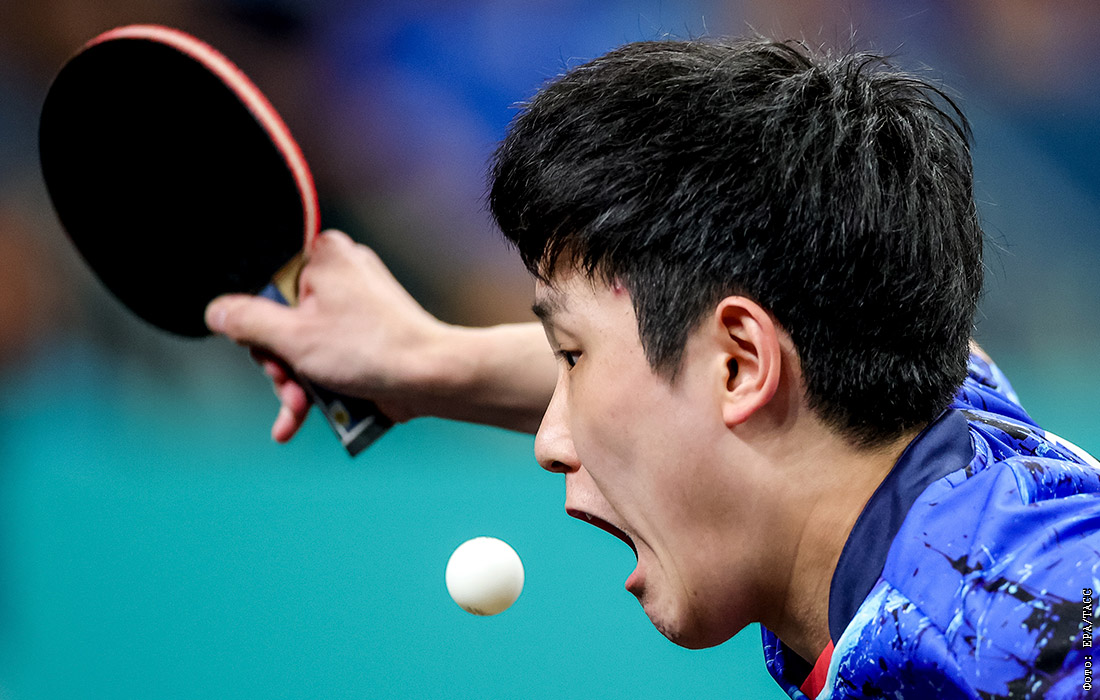 Томокадзу Харимото из Японии во время матча 1/8 финала мужского одиночного разряда по настольному теннису