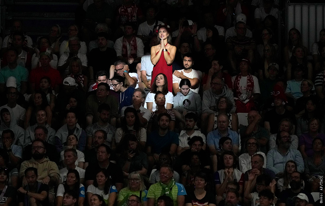 Зрители наблюдает за четвертьфинальным матчем по волейболу среди мужчин между Словенией и Польшей