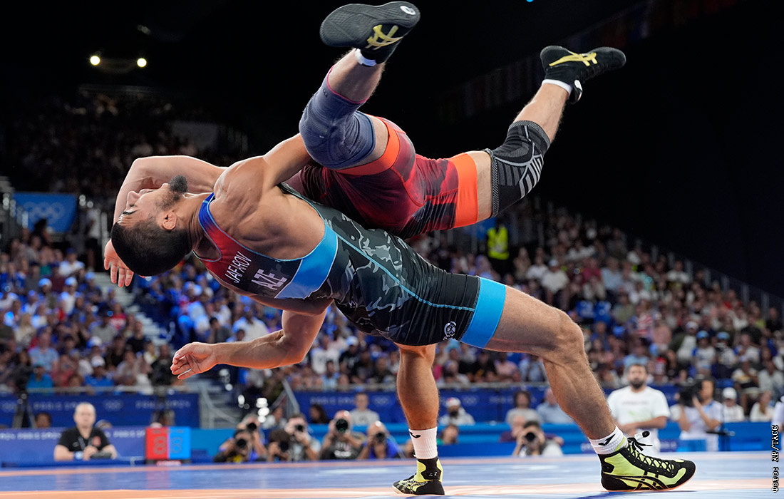 Амантур Исмаилов из Кыргызстан и Хасрат Джафаров из Азербайджана в поединке за бронзовую медаль по греко-римской борьбе в весовой категории до 67 кг