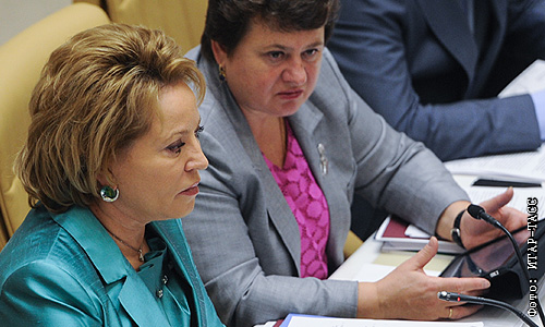 Председатель Совета Федерации РФ Валентина Матвиенко и заместитель председателя Совета Федерации РФ Светлана Орлова (слева направо) во время первого заседания осенней сессии Совета Федерации РФ.