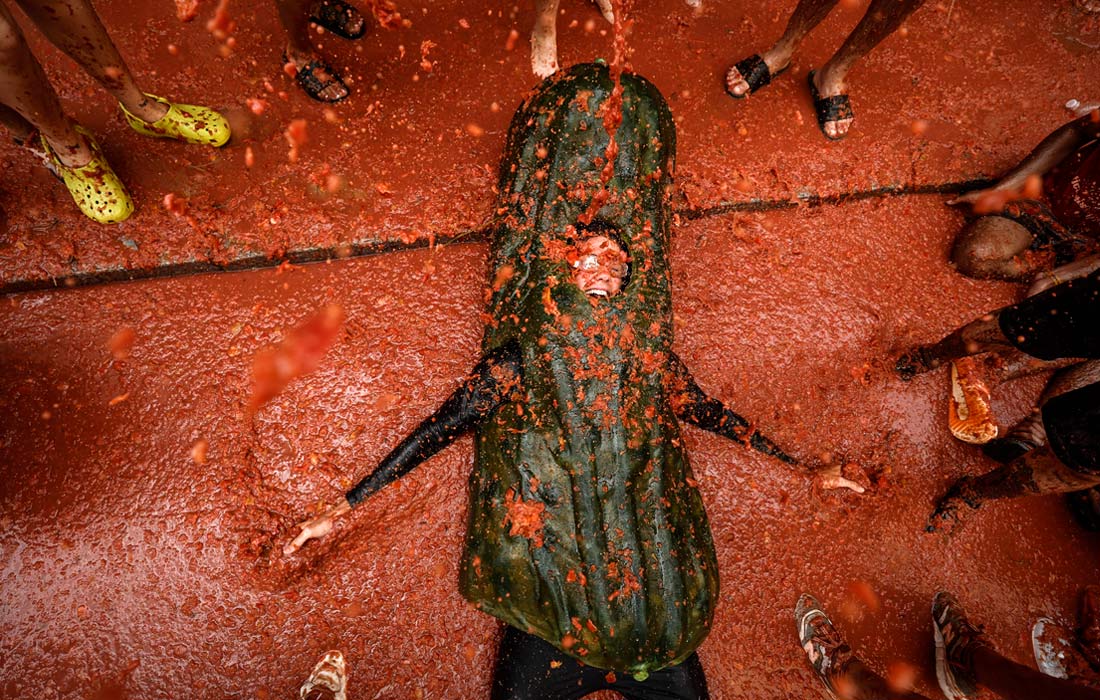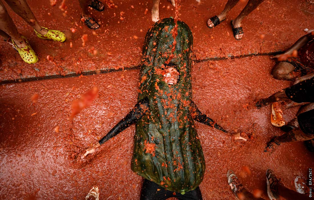 В испанском городе Буньоле недалеко от Валенсии прошел ежегодный праздник Ла Томатина, во время которого на улицах развернулась настоящая битва помидорами. В мероприятии ежегодно принимают участие более 20 тысяч человек. Для "побоища" понадобилось шесть грузовиков со 150 тоннами спелых томатов.
