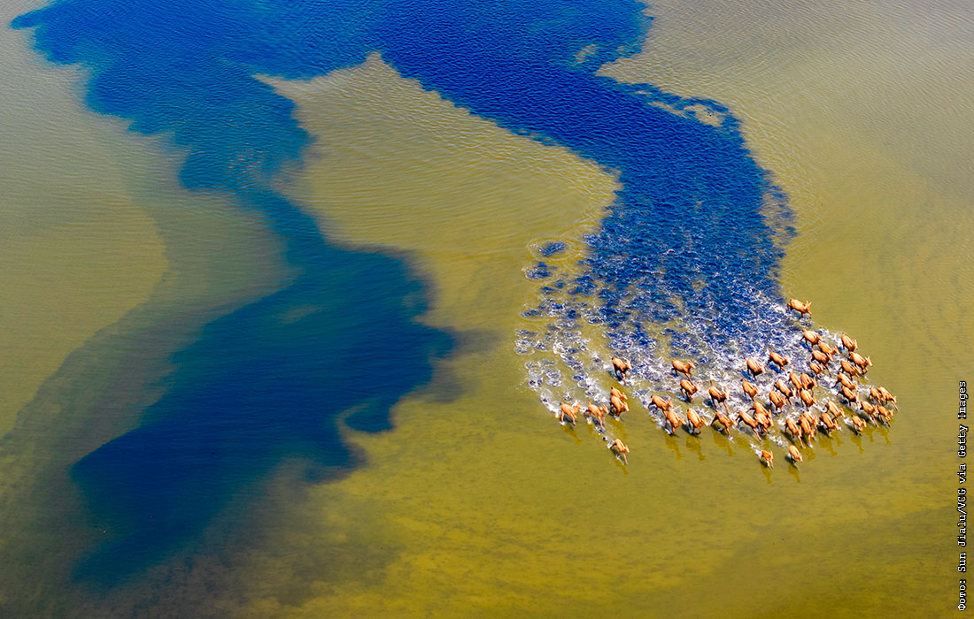 Стадо оленей милу в водно-болотных угодьях Тяозини, Китай