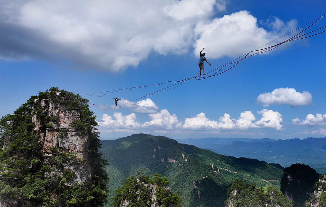 Спортсмены по слэклайну в национальном лесном парке Чжанцзяцзе, Китай