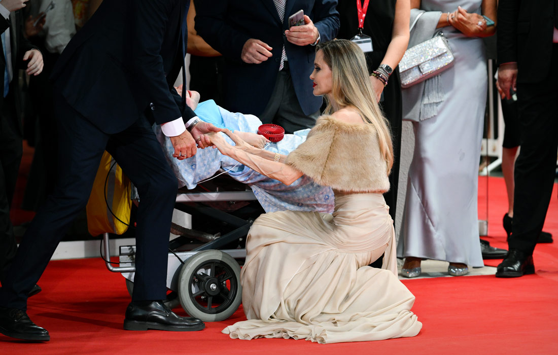 Анджелина Джоли приветствует поклонника перед премьерой фильма "Мария"