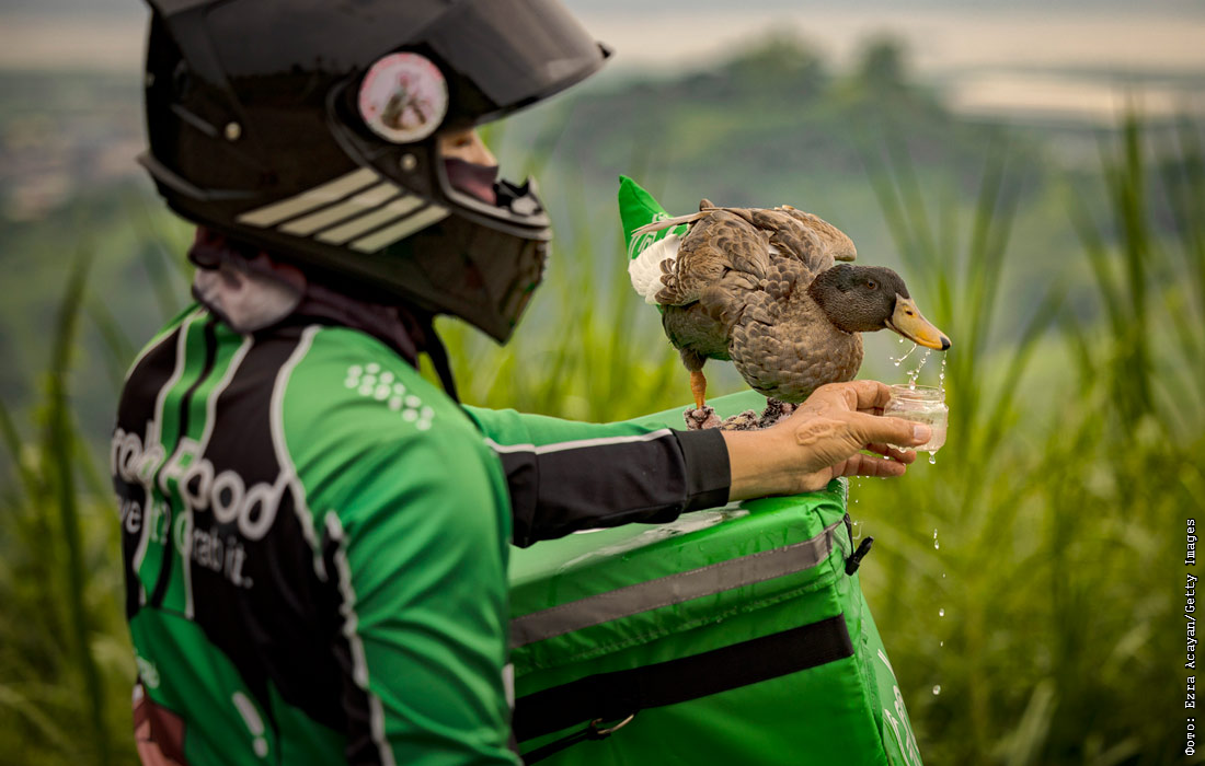 Курьер компании GrabFood с домашней уткой в Ангоно, Филиппины