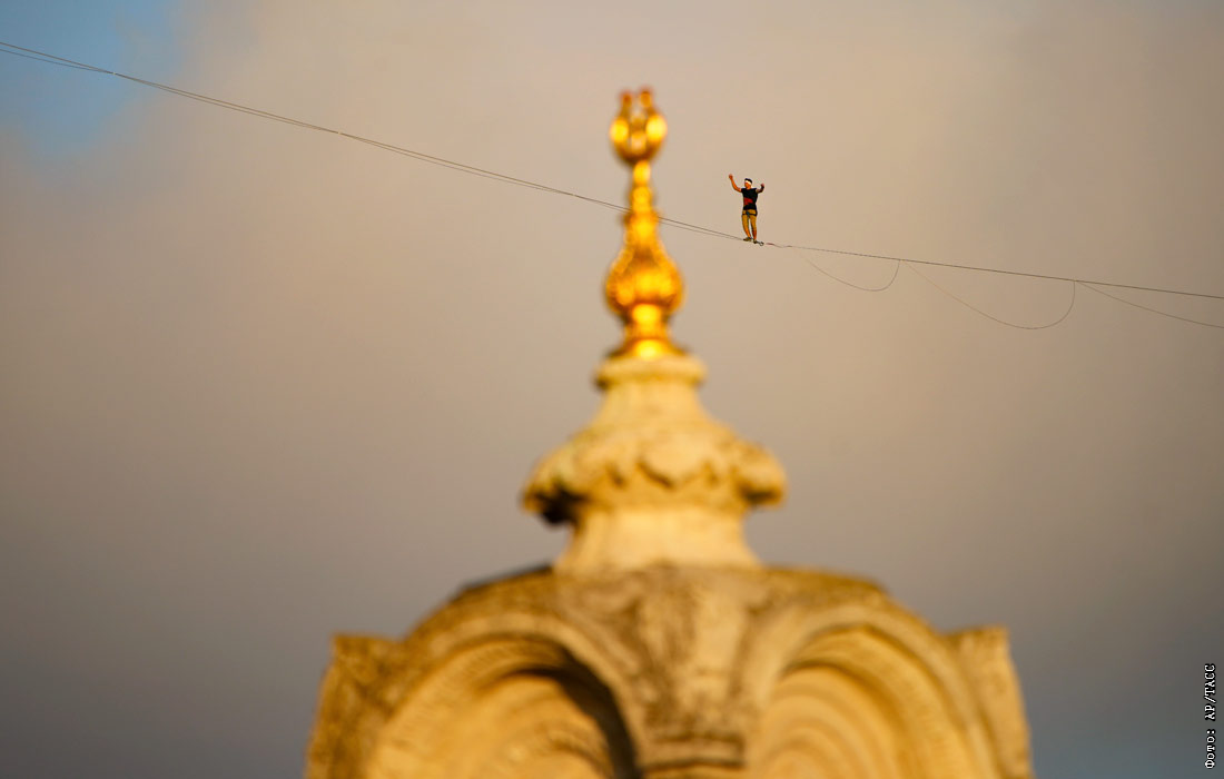Эстонский слэклайнер Яан Роозе над Босфорским проливом в Стамбуле