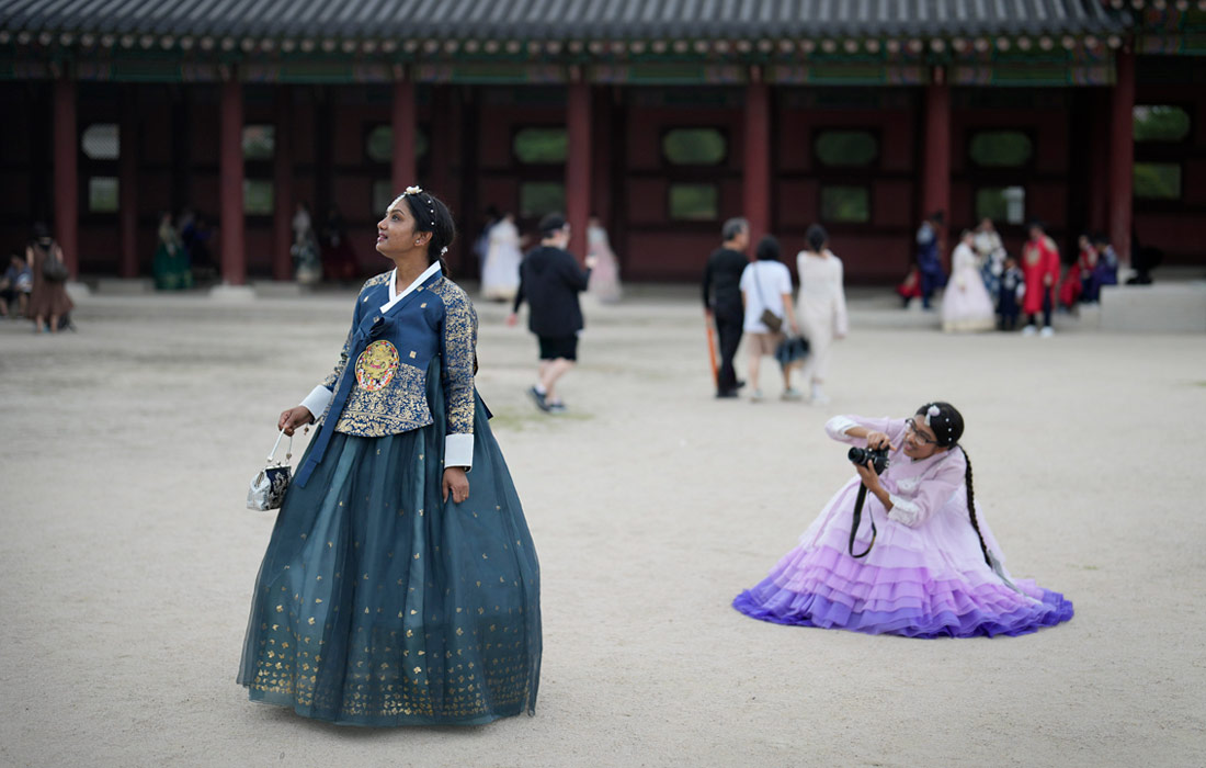 Туристы из Бангладеш в традиционных корейских нарядах во дворце Кенбоккун в Сеуле