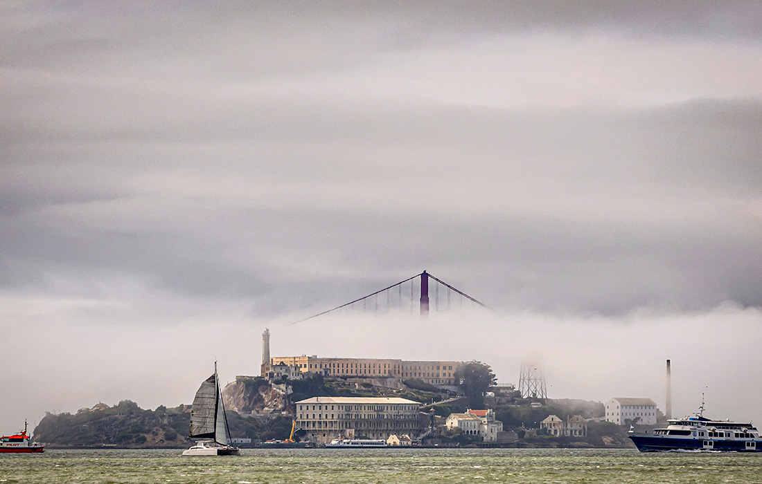 Облака и туман над мостом Золотые Ворота и островом Алькатрас в заливе Сан-Франциско