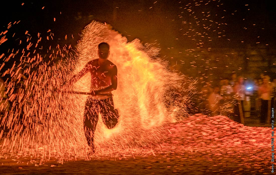 Деревенский житель проходит по горящим углям во время фестиваля середины осени в китайской провинции Чжэцзян