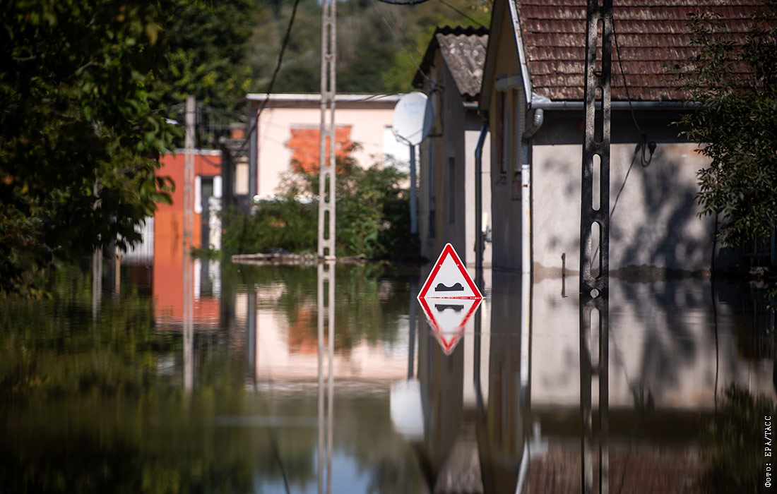 Затопленные дома из-за пика уровня воды в реке Дунай в курортной зоне Баха, Венгрия
