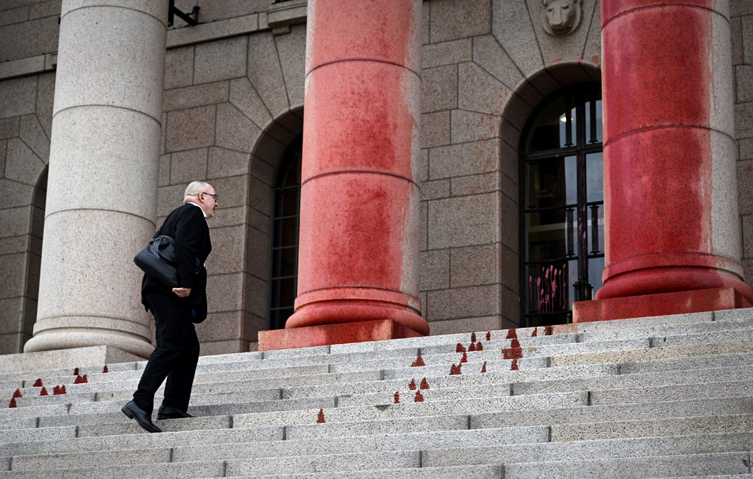 Экологические активисты движения Extinction Rebellion облили красной краской здание парламента Финляндии в Хельсинки