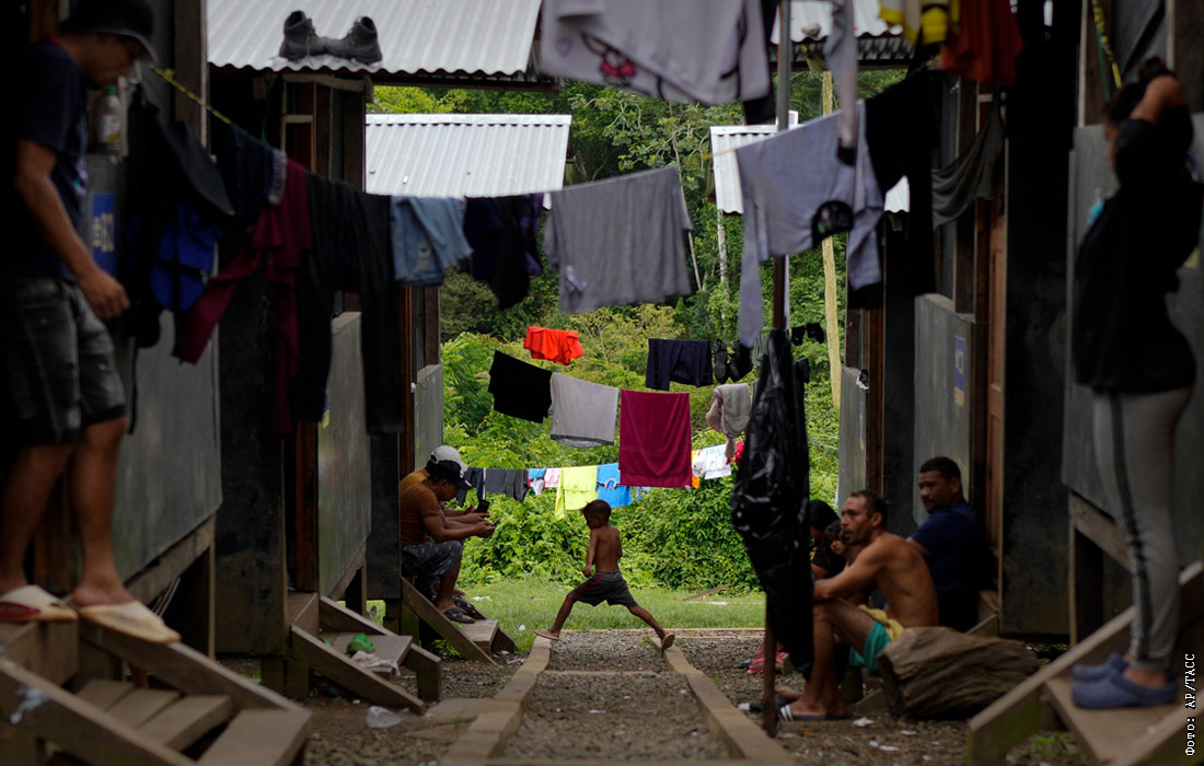 Мигранты, направляющиеся в США, отдыхают в центре временного размещения беженцев в Лахас-Бланкас, Панама