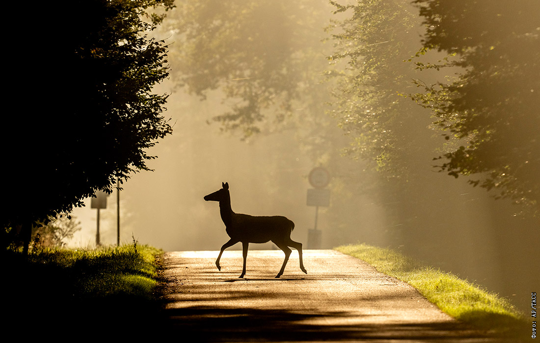 Олень переходит дорогу в лесах региона Таурус недалеко от Франкфурта, Германия