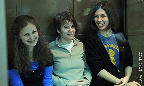 Участницы феминистской панк-группы Pussy Riot Мария Алехина, Екатерина Самуцевич и Надежда Толоконникова (слева направо), осужденные на 2 года лишения свободы за хулиганство в храме Христа Спасителя, во время рассмотрения кассационной жалобы на приговор в Мосгорсуде.