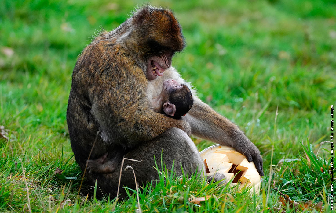 Макаки с тыквой в сафари-парке Блэра Драммонда в Великобритании
