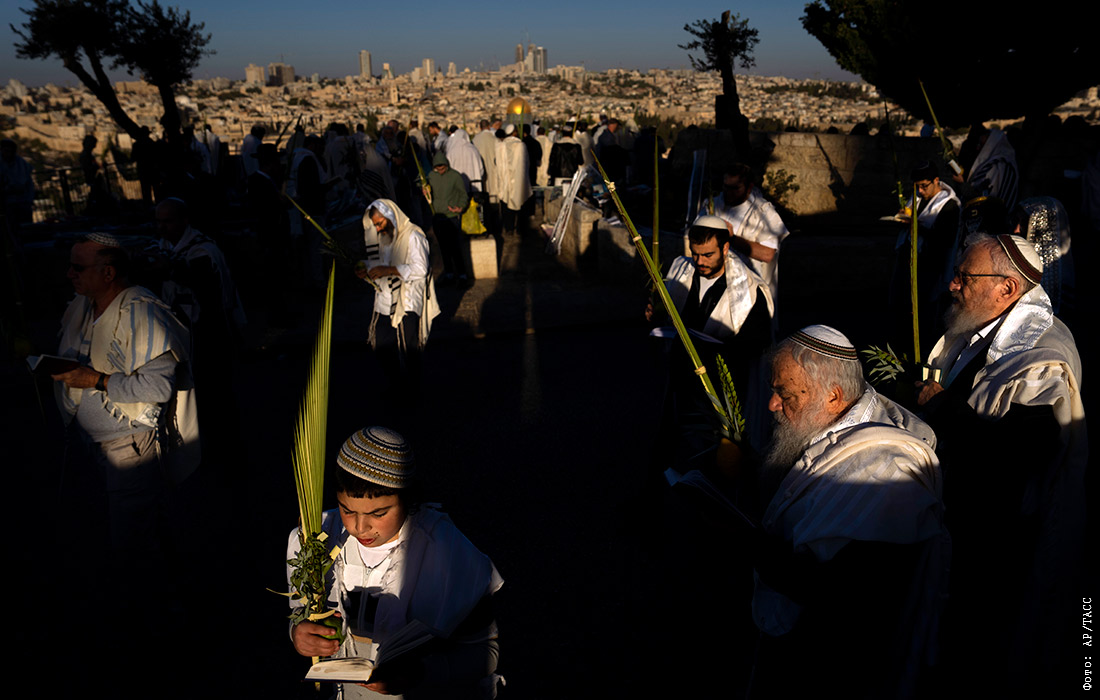 Ультраортодоксальные евреи совершают молитву на Масличной горе с видом на Старый город Иерусалима