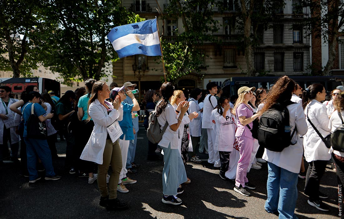 Врачи и учителя в Буэнос-Айресе на протесте против недостаточного финансирования работы государственных больниц и университетов, низких зарплат и увольнений в секторе здравоохранения