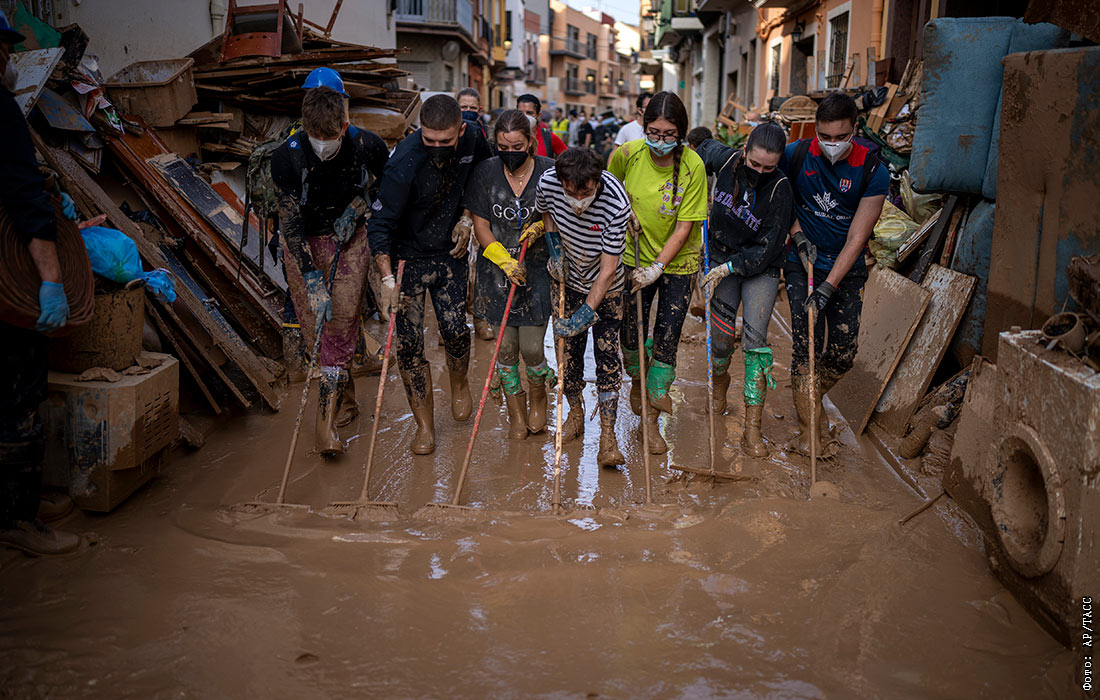 Волонтеры и жители очищают улицы от грязи в районе, пострадавшем от наводнения в Пайпорте, Валенсия, Испания