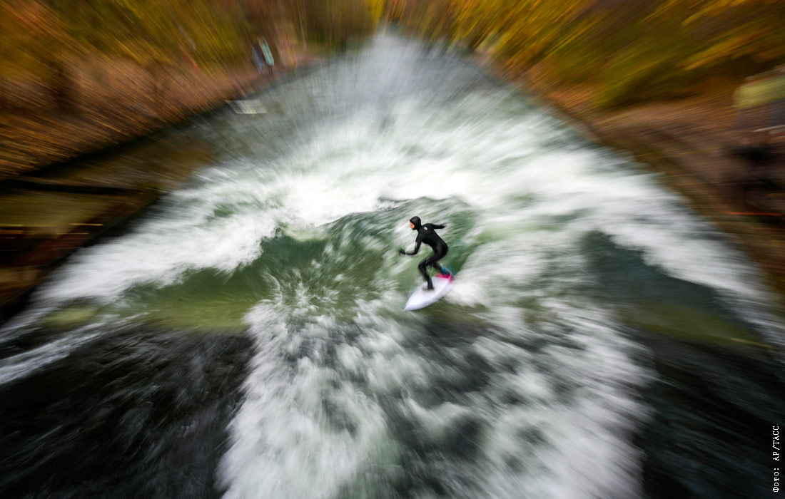 Серфер катается на искусственной волне в реке Айсбах в центре Мюнхена