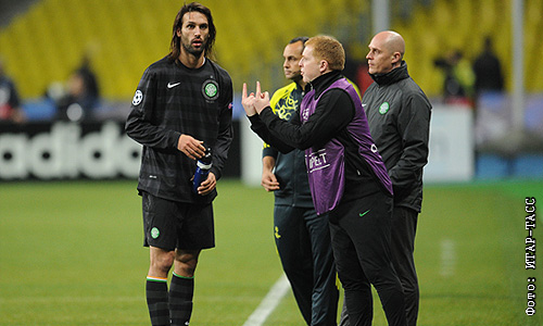 Игрок "Селтика" Георгиос Самарас и главный тренер "Селтика" Нил Леннон (слева направо на первом плане) в матче группового этапа Лиги чемпионов по футболу "Спартак" (Москва, Россия) - "Селтик" (Глазго, Шотландия).