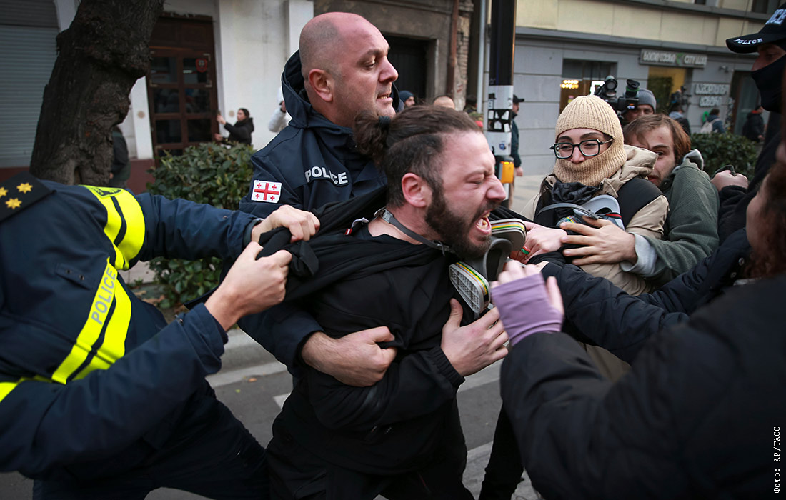 Полиция пытается задержать протестующего во время митинга против результатов парламентских выборов в Тбилиси