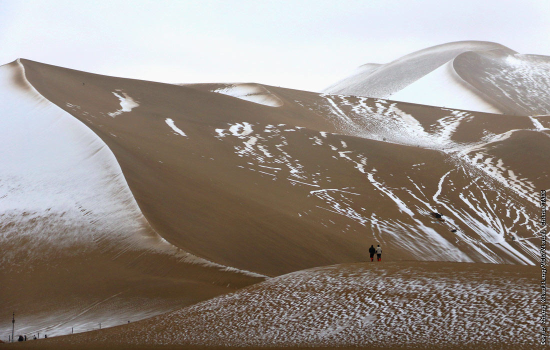 Песчаные дюны в китайском Дуньхуане после снегопада